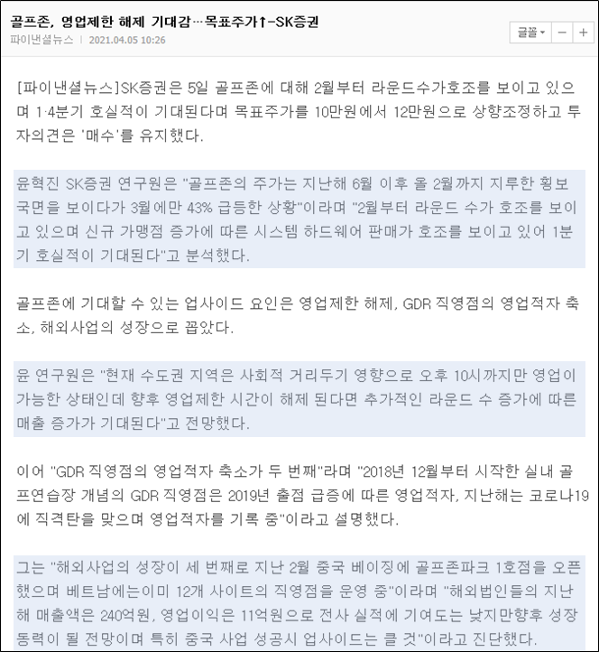 우선 코로나로 인해서 10시까지 밖에 영업을 못하는데 영업제한 시간이 해제되면 라운드가 증가하게 되고, 궁극적으로 추가적인 매출이 생겨나겠죠.